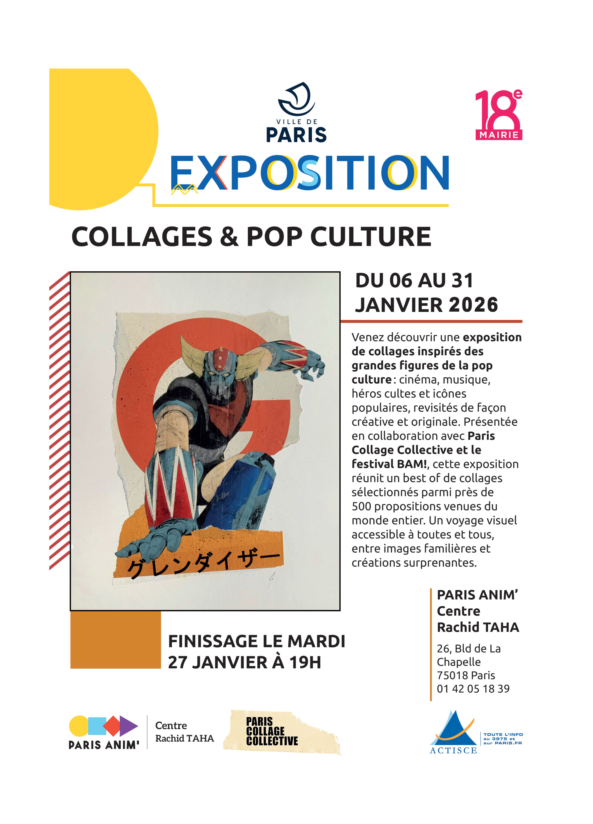 Nous présentons une mini-exposition de 50 collages du BAM – Festival of Pop Culture, en exposition au Centre Anim Rachid Taha à Paris — un lieu qui nous a déjà accueillis par le passé et qui continue de soutenir nos projets en ouvrant une nouvelle fois ses murs.